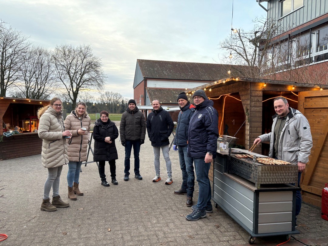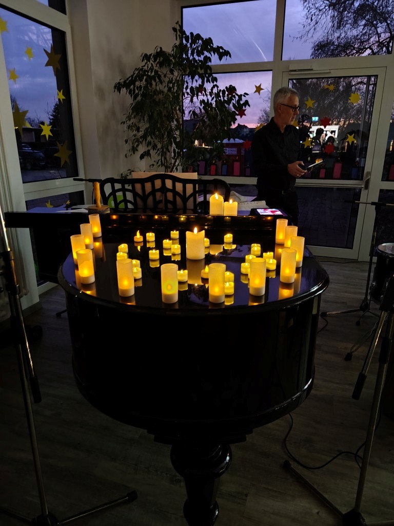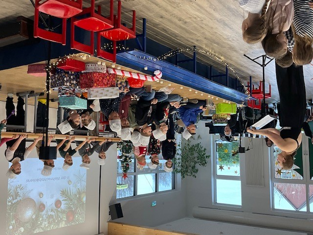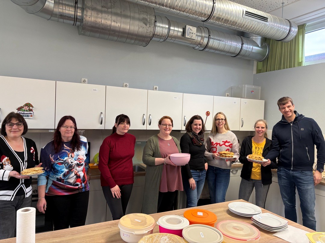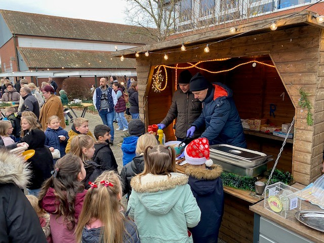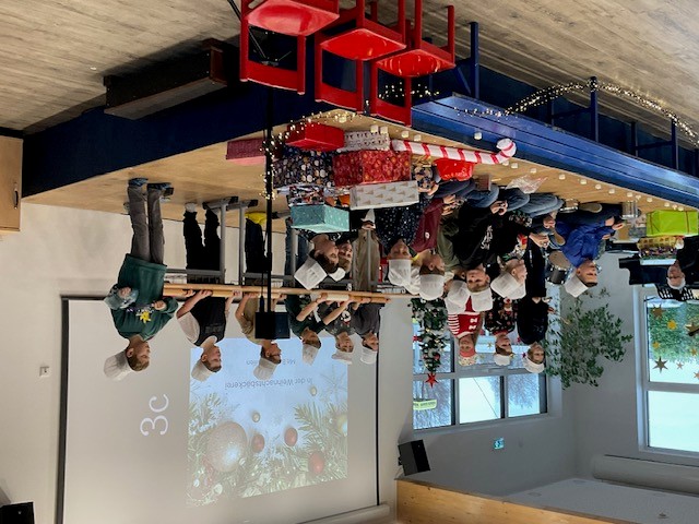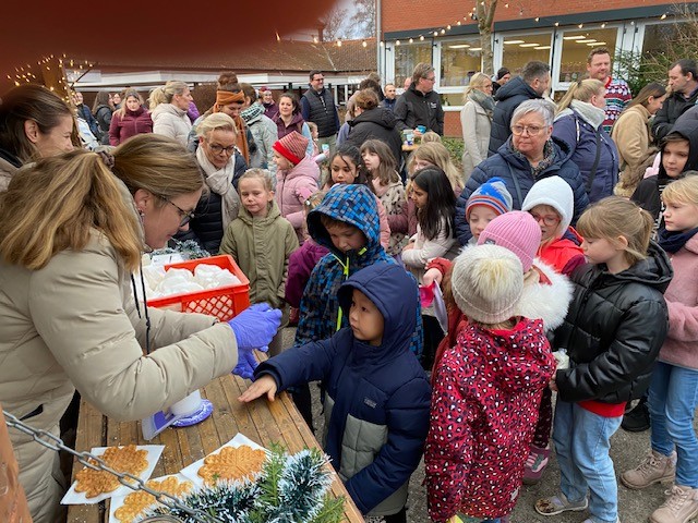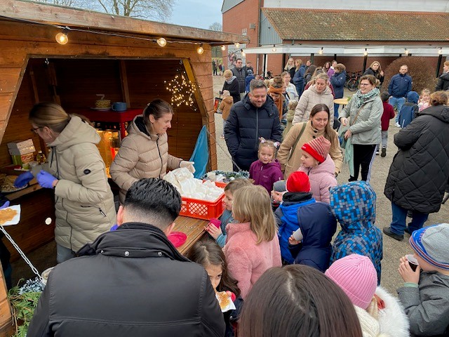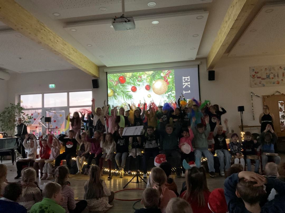 Am 18.12.25 fand bei uns eine große Weihnachtsfeier mit allen Klassen statt. In den ersten beiden Stunden feierten die Eingangsklassen, d.h. sie führten zunächst in der Aula viele unterschiedliche Lieder, oft auch mit Instrumentalbegleitung und entsprechender Verkleidung auf. Danach wurde auf dem kleinen Weihnachtsmarkt auf dem Schulhof geschmaust. Der Förderverein und der Schulelternrat hatten sich wieder ordentlich ins Zeug gelegt und viele Leckereien für die Kinder vorbereitet. Es gab Waffeln, Popcorn, Würstchen und Kinderpunsch.