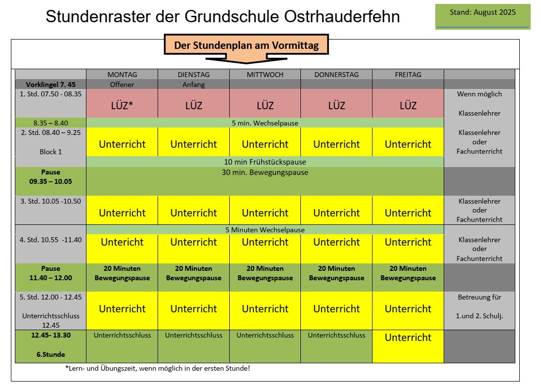 Der Unterricht beginnt täglich um 7.50 Uhr. Damit die Kinder um 7.50 Uhr bereit zum Lernen sind, klingelt es bereits einmal um 7.45 Uhr, sodass sie spätestens dann beginnen sollen alle Lernmaterialien bereitzulegen.