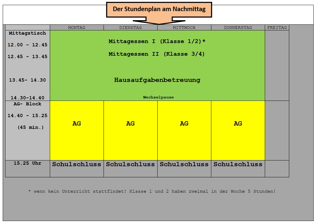Falls Ihr Kind am Ganztag teilnimmt, endet der Unterricht an diesen Tagen um 15.25 Uhr.